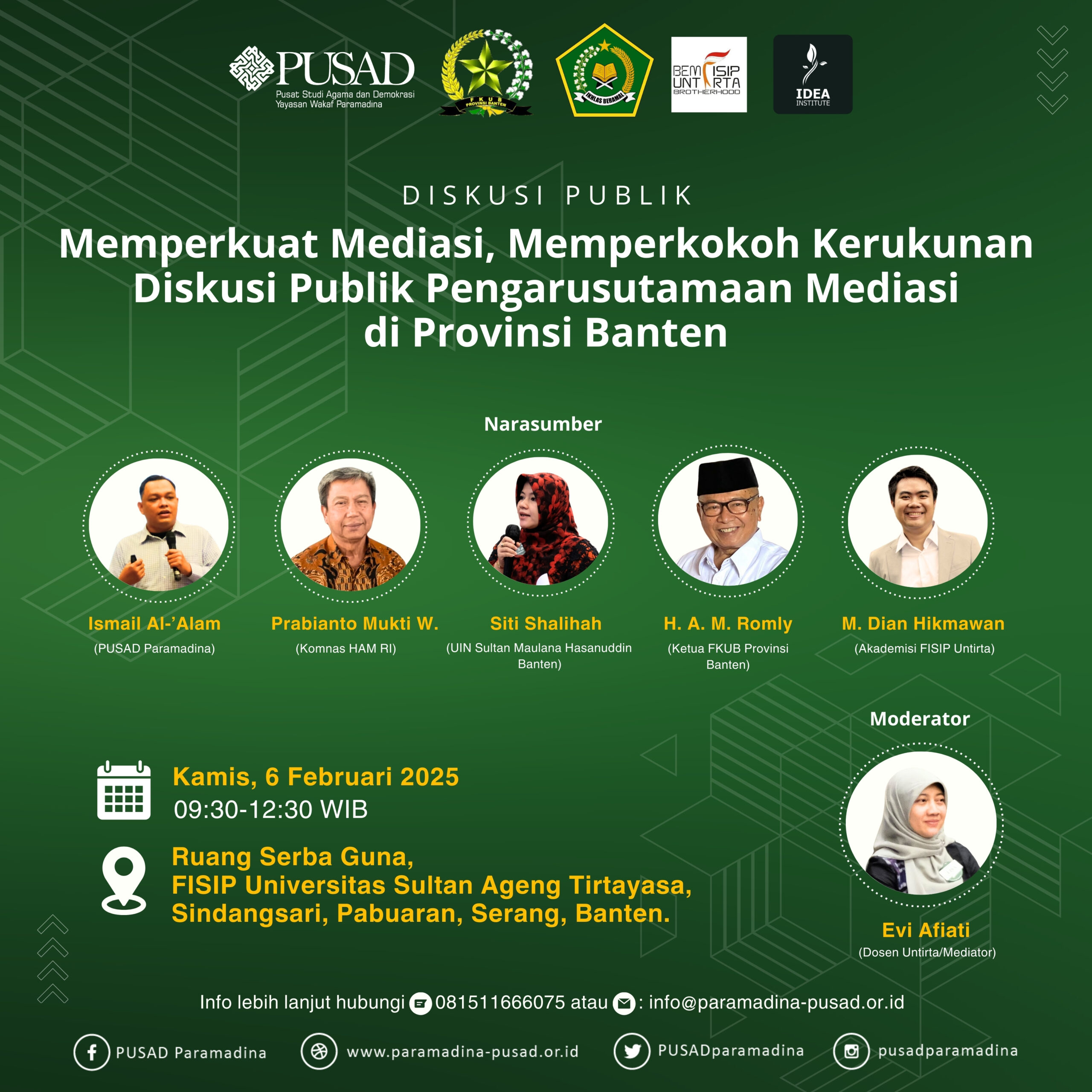 01 Feb Memperkuat Mediasi, Memperkokoh Kerukunan: Diskusi Publik Pengarusutamaan Mediasi di Provinsi Banten đź—“ Posted at 13:53h in Agenda by PUSAD Paramadina 0 Likes Related 06 Februari 2025 from 09:00 to 13:00 Scheduled ical Google outlook Agenda